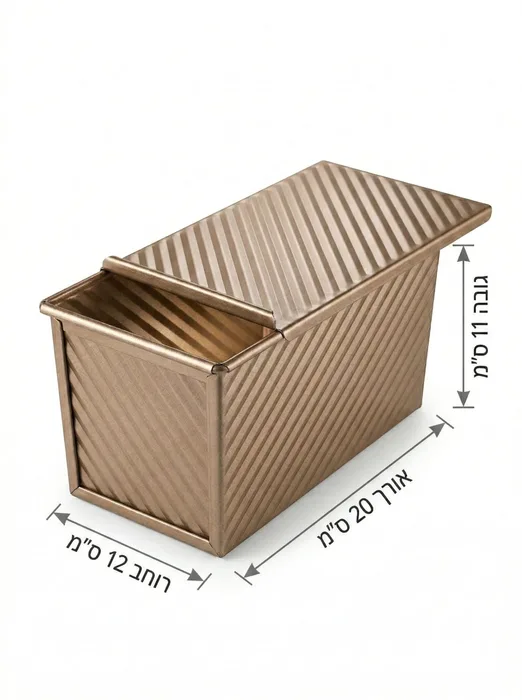 הפכו כל מאפה ביתי לחוויית בוטיק. תבנית הלחם המקצועית שלנו, בעיצוב פולמן (Pullman) עם מכסה נשלף, מעוצבת כדי לתת לכם תוצאות אחידות ומדוייקות, ישירות מהתנור הביתי. עם גימור ברונזה אלגנטי וטקסטורה חכמה, זו התבנית שתגרום לכם להתאהב באפיית לחם מחדש.